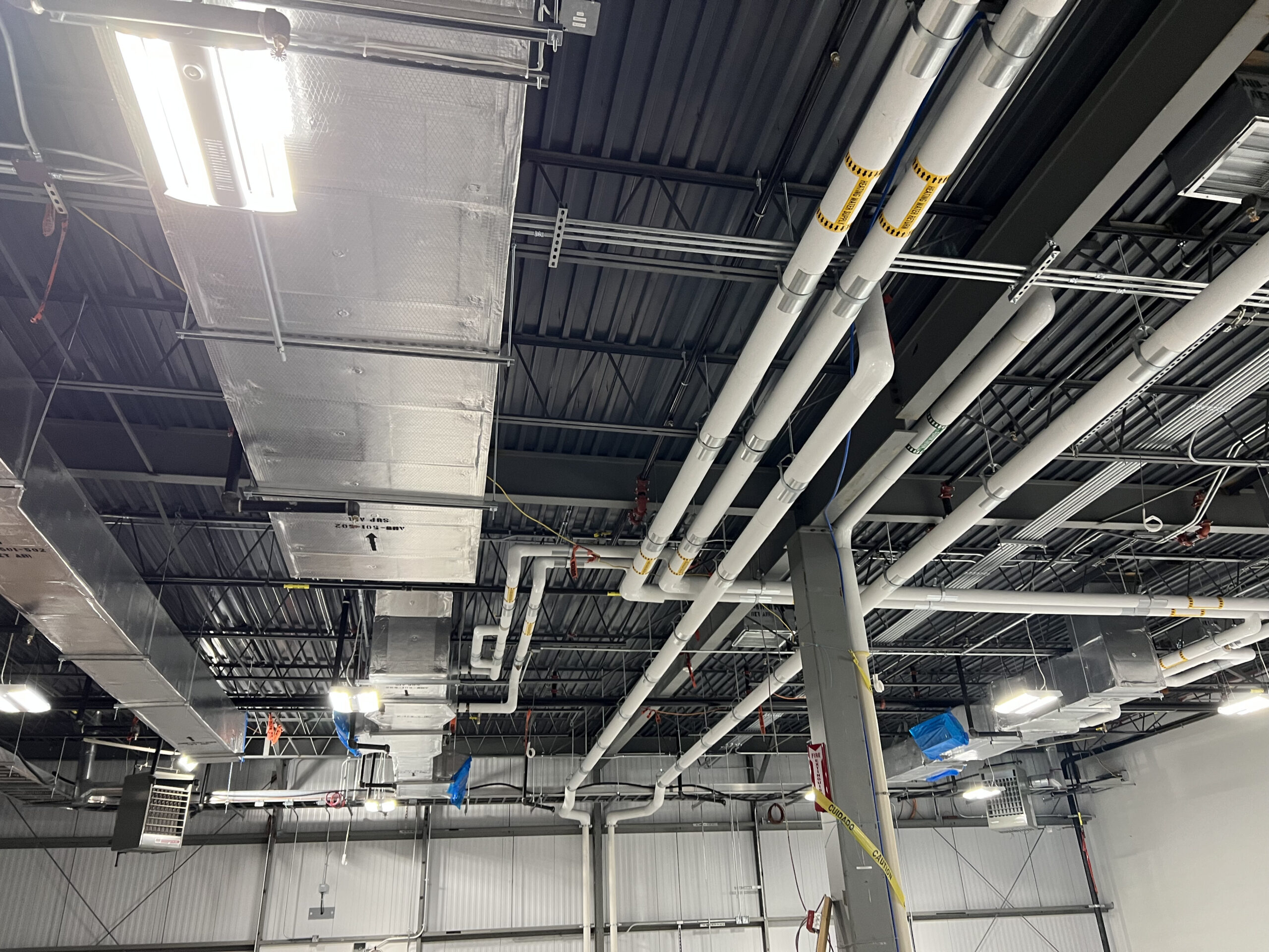 Warehouse: Insulation at Novo is something that we take seriously. The specs for the warehouse called for 2” thick 6# FSK board. The higher-density board is pin-welded onto the bottom of the ductwork to ensure it is properly retained. The higher-density board has higher insulating properties and is superior to the lower-density 3# board that is typically used.
