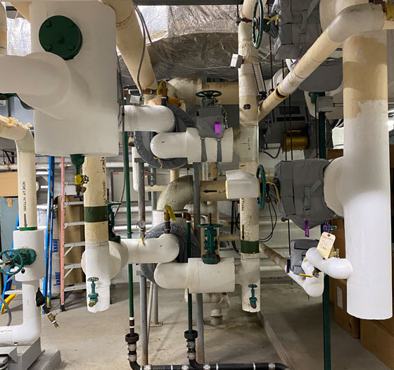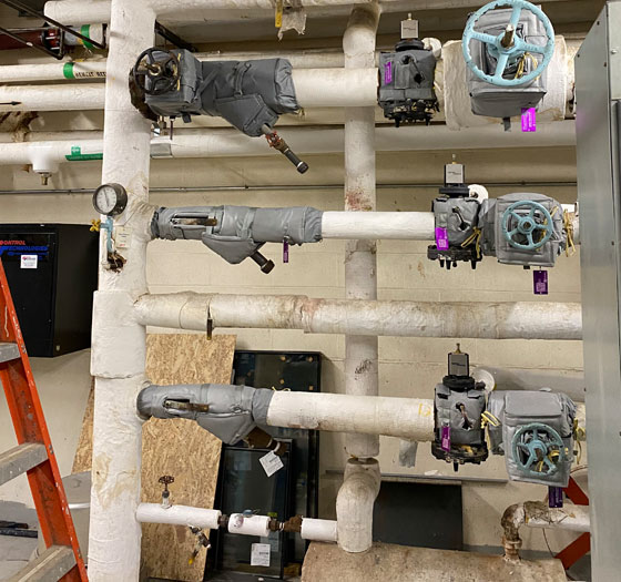 For the initial phase of the project, we focused on the major areas, bare piping and equipment like condensate tanks or pump boxes, as well as repairing insulation with ASJ paper that was falling off or insulation that had been damaged over time. We worked in the following mechanical spaces: